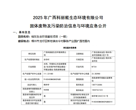 梧州市科丽能环保U技有限公司成立?018q??0日,位于梧州市龙圩区梧州q口再生资源加工园区内,业务늛危险废物的综合利用与环保技术服务支持。目前已具备废矿物a(b)QHW08Q、煤焦a(b)QHW11)两大cd险废物经营资质,危险废物处置能力辑ֈ20万吨/q_(d)其中废矿物a(b)10万吨/q、煤焦a(b)10万吨/q?br>